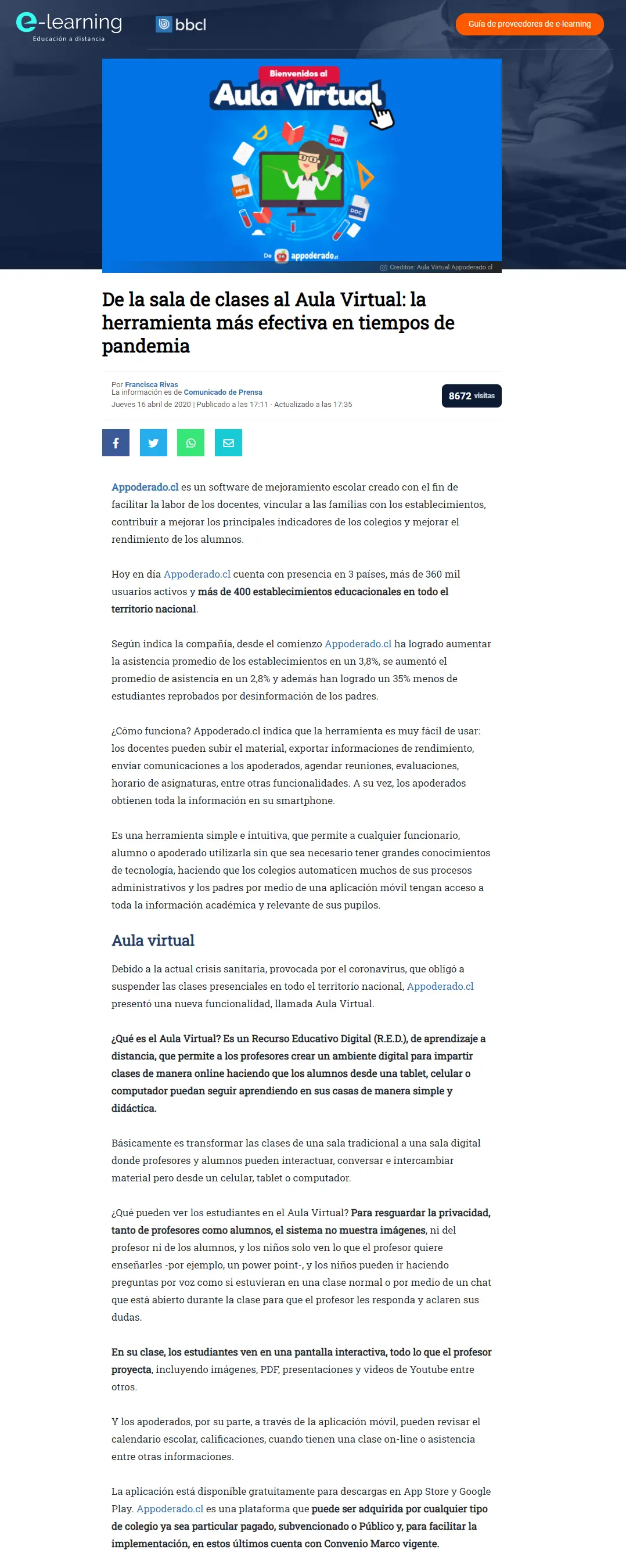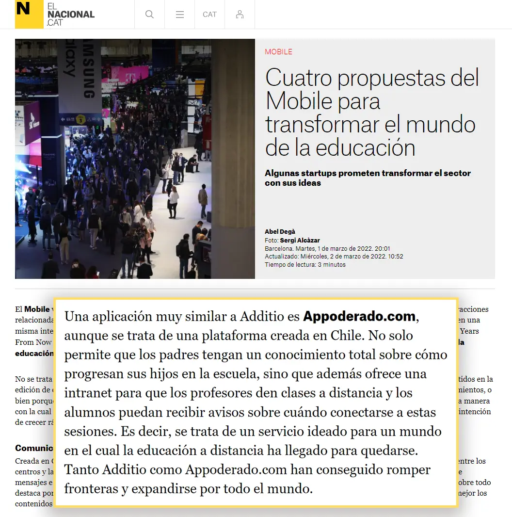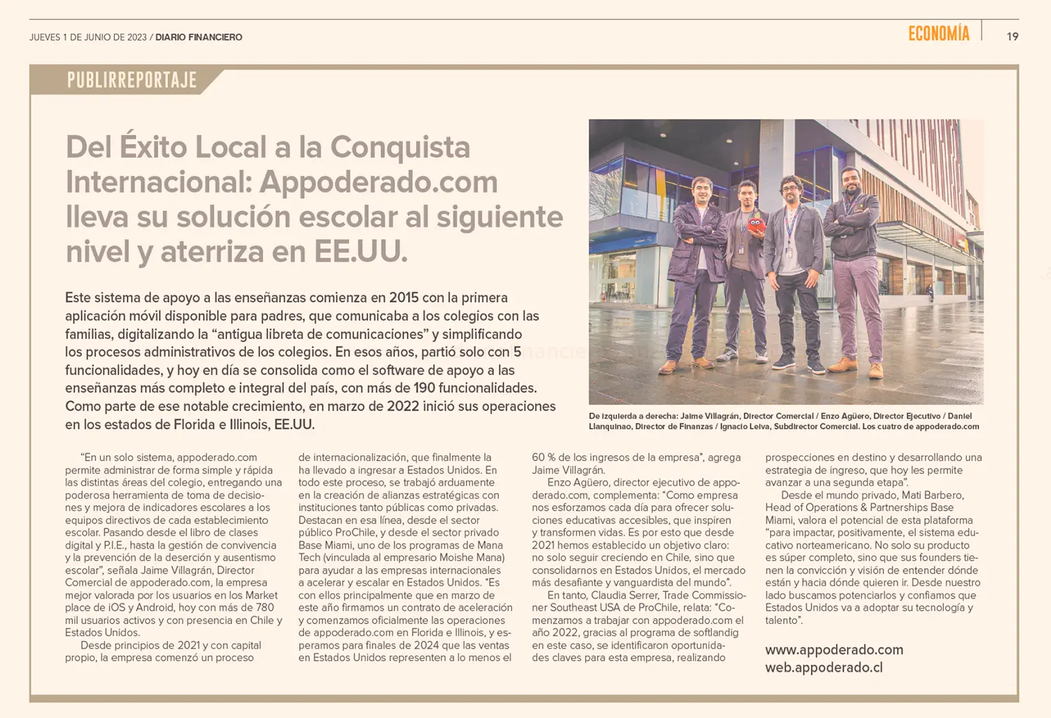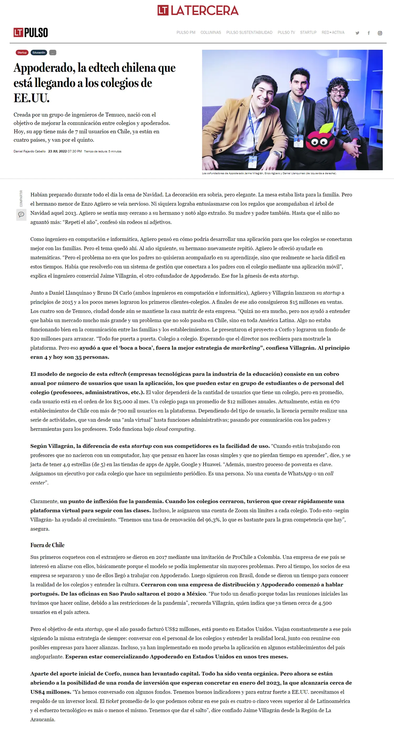 Descubre la cobertura de prensa de Appoderado.com. Medios en todo Chile reconocen nuestra plataforma de gestión escolar como una edtech chilena líder en innovación.