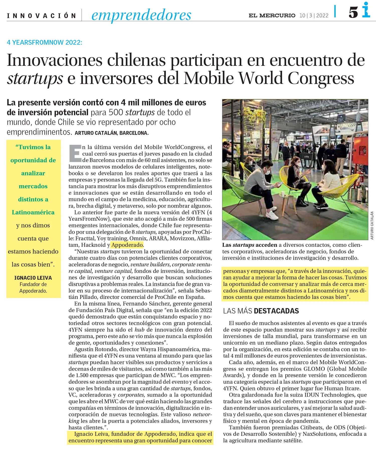 Innovaciones chilenas participan en encuentro de startups e inversores del Mobile World Congress. La presente versión contó con 4 mil millones de euros de inversión potencial para 500 startups de todo el mundo, donde Chile se vio representado por och...